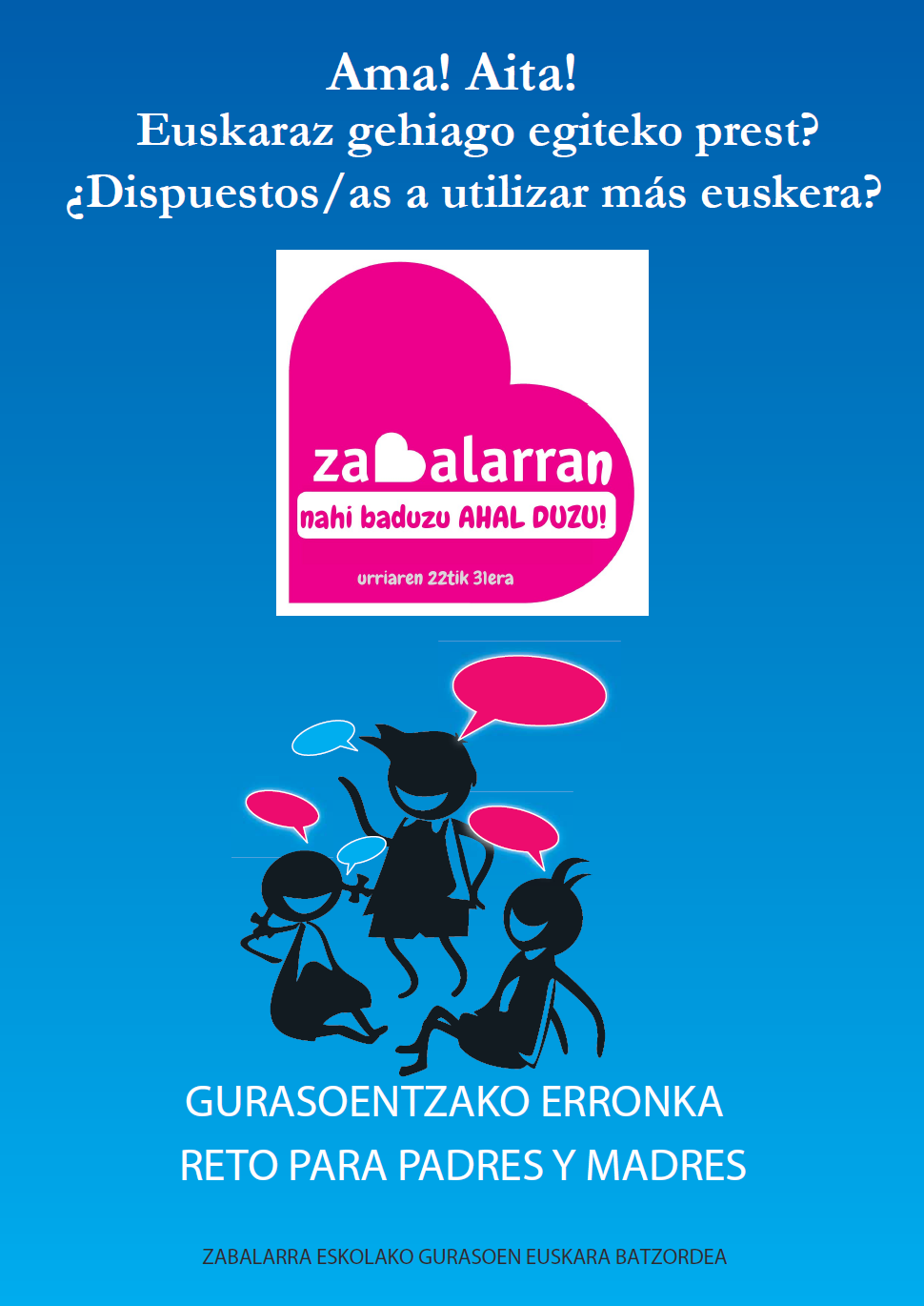 GURASOENTZAKO ERRONKA! 2018-10-15 IgeZabalarraAmpa No Comments Sin categoría, ZERK ELKARTZEN GAITU? Euskara gehiago erabiltzeko gurasoentzako erronka urriaren 22tik 31ra. Animatu eta har ezazu parte erronkan! Partekatu Post navigation ← previous postNext Post →